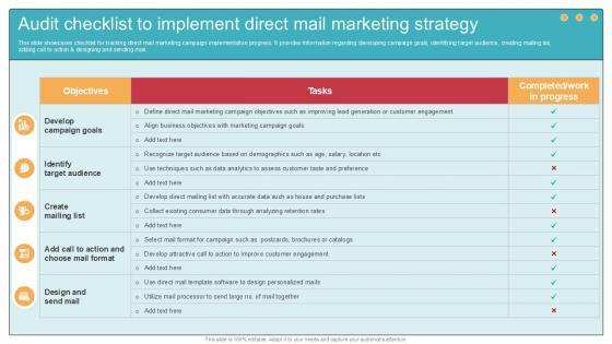This slide showcases checklist for tracking direct mail marketing campaign implementation progress. It provides information regarding developing campaign goals, identifying target audience, creating mailing list, adding call to action and designing and sending mail. Want to ace your presentation in front of a live audience Our Audit Checklist To Implement Direct Comprehensive Guide To Wholesale Ppt Slide can help you do that by engaging all the users towards you. Slidegeeks experts have put their efforts and expertise into creating these impeccable powerpoint presentations so that you can communicate your ideas clearly. Moreover, all the templates are customizable, and easy-to-edit and downloadable. Use these for both personal and commercial use. This slide showcases checklist for tracking direct mail marketing campaign implementation progress. It provides information regarding developing campaign goals, identifying target audience, creating mailing list, adding call to action and designing and sending mail.