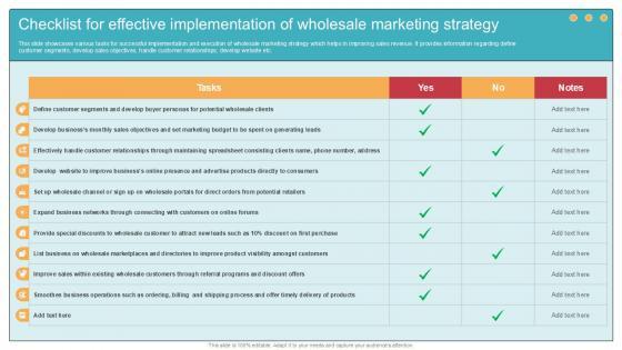 This slide showcases various tasks for successful implementation and execution of wholesale marketing strategy which helps in improving sales revenue. It provides information regarding define customer segments, develop sales objectives, handle customer relationships, develop website etc. If your project calls for a presentation, then Slidegeeks is your go-to partner because we have professionally designed, easy-to-edit templates that are perfect for any presentation. After downloading, you can easily edit Checklist For Effective Implementation Comprehensive Guide To Wholesale Ppt Example and make the changes accordingly. You can rearrange slides or fill them with different images. Check out all the handy templates This slide showcases various tasks for successful implementation and execution of wholesale marketing strategy which helps in improving sales revenue. It provides information regarding define customer segments, develop sales objectives, handle customer relationships, develop website etc.