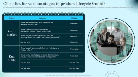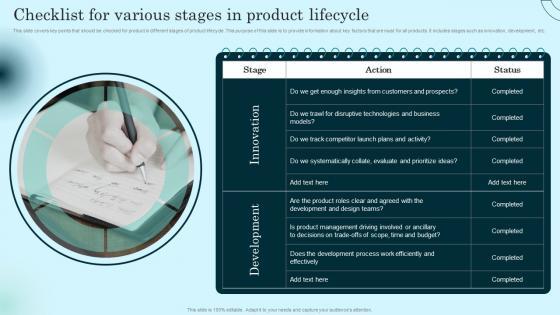 This slide covers key points that should be checked for product in different stages of product lifecycle. This purpose of this slide is to provide information about key factors that are must for all products. It includes stages such as innovation, development, etc. Want to ace your presentation in front of a live audience Our Checklist For Various Stages In Product Lifecycle Comprehensive Guide To Product Lifecycle Diagrams Pdf can help you do that by engaging all the users towards you. Slidegeeks experts have put their efforts and expertise into creating these impeccable powerpoint presentations so that you can communicate your ideas clearly. Moreover, all the templates are customizable, and easy to edit and downloadable. Use these for both personal and commercial use. This slide covers key points that should be checked for product in different stages of product lifecycle. This purpose of this slide is to provide information about key factors that are must for all products. It includes stages such as innovation, development, etc.