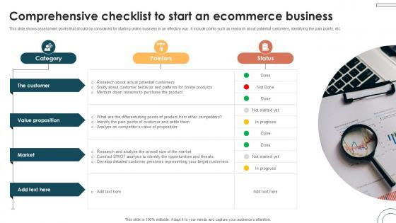 This slide shows assessment points that should be considered for starting online business in an effective way. It include points such as research about potential customers, identifying the pain points, etc. Whether you have daily or monthly meetings, a brilliant presentation is necessary. Comprehensive Checklist To Start Internet Based Trade Structure Ppt Example can be your best option for delivering a presentation. Represent everything in detail using Comprehensive Checklist To Start Internet Based Trade Structure Ppt Example and make yourself stand out in meetings. The template is versatile and follows a structure that will cater to your requirements. All the templates prepared by Slidegeeks are easy to download and edit. Our research experts have taken care of the corporate themes as well. So, give it a try and see the results. This slide shows assessment points that should be considered for starting online business in an effective way. It include points such as research about potential customers, identifying the pain points, etc.