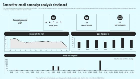 This slide showcases a dashboard for analyzing competitors top email campaigns to optimize own business promotional campaigns. It highlights elements such as campaign name, emails captured, web screenshots, yearly email send, days email send and hours of email send. Welcome to our selection of the Competitor Email Campaign Analysis Dashboard Comprehensive Guide Inspiration Pdf These are designed to help you showcase your creativity and bring your sphere to life. Planning and Innovation are essential for any business that is just starting out. This collection contains the designs that you need for your everyday presentations. All of our PowerPoints are 100 percent editable, so you can customize them to suit your needs. This multi-purpose template can be used in various situations. Grab these presentation templates today. This slide showcases a dashboard for analyzing competitors top email campaigns to optimize own business promotional campaigns. It highlights elements such as campaign name, emails captured, web screenshots, yearly email send, days email send and hours of email send.