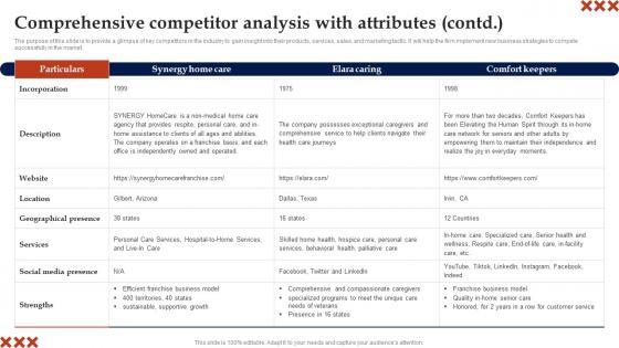 The purpose of this slide is to provide a glimpse of key competitors in the industry to gain insight into their products, services, sales, and marketing tactic. It will help the firm implement new business strategies to compete successfully in the market. Formulating a presentation can take up a lot of effort and time, so the content and message should always be the primary focus. The visuals of the PowerPoint can enhance the presenters message, so our Comprehensive Competitor Analysis With Attributes Contd Group Training Business Introduction Pdf was created to help save time. Instead of worrying about the design, the presenter can concentrate on the message while our designers work on creating the ideal templates for whatever situation is needed. Slidegeeks has experts for everything from amazing designs to valuable content, we have put everything into Comprehensive Competitor Analysis With Attributes Contd Group Training Business Introduction Pdf The purpose of this slide is to provide a glimpse of key competitors in the industry to gain insight into their products, services, sales, and marketing tactic. It will help the firm implement new business strategies to compete successfully in the market.