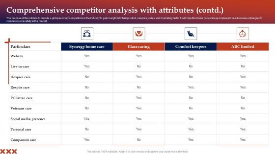 The purpose of this slide is to provide a glimpse of key competitors in the industry to gain insight into their products, services, sales, and marketing tactic. It will help the firm implement new business strategies to compete successfully in the market. Want to ace your presentation in front of a live audience Our Comprehensive Competitor Analysis With In Home Care Business Plan Sample Pdf can help you do that by engaging all the users towards you. Slidegeeks experts have put their efforts and expertise into creating these impeccable powerpoint presentations so that you can communicate your ideas clearly. Moreover, all the templates are customizable, and easy-to-edit and downloadable. Use these for both personal and commercial use. The purpose of this slide is to provide a glimpse of key competitors in the industry to gain insight into their products, services, sales, and marketing tactic. It will help the firm implement new business strategies to compete successfully in the market.