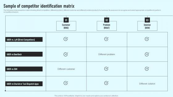 The following slide presents a matrix showing direct competition, different problem, different customer and different solution product of a business. Its purpose is to recognize and select appropriate competitors to perform competitive analysis. Find highly impressive Sample Of Competitor Identification Matrix Comprehensive Guide Elements Pdf on Slidegeeks to deliver a meaningful presentation. You can save an ample amount of time using these presentation templates. No need to worry to prepare everything from scratch because Slidegeeks experts have already done a huge research and work for you. You need to download Sample Of Competitor Identification Matrix Comprehensive Guide Elements Pdf for your upcoming presentation. All the presentation templates are 100 percent editable and you can change the color and personalize the content accordingly. Download now. The following slide presents a matrix showing direct competition, different problem, different customer and different solution product of a business. Its purpose is to recognize and select appropriate competitors to perform competitive analysis.