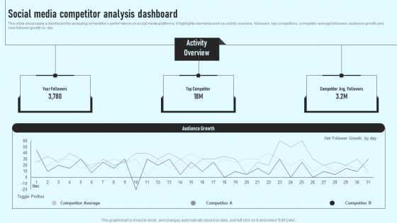 This slide showcases a dashboard for analyzing competitors performance on social media platforms. It highlights elements such as activity overview, followers, top competitors, competitor average followers, audience growth and new follower growth by day. Crafting an eye-catching presentation has never been more straightforward. Let your presentation shine with this tasteful yet straightforward Social Media Competitor Analysis Dashboard Comprehensive Guide Topics Pdf template. It offers a minimalistic and classy look that is great for making a statement. The colors have been employed intelligently to add a bit of playfulness while still remaining professional. Construct the ideal Social Media Competitor Analysis Dashboard Comprehensive Guide Topics Pdf that effortlessly grabs the attention of your audience. Begin now and be certain to wow your customers. This slide showcases a dashboard for analyzing competitors performance on social media platforms. It highlights elements such as activity overview, followers, top competitors, competitor average followers, audience growth and new follower growth by day.