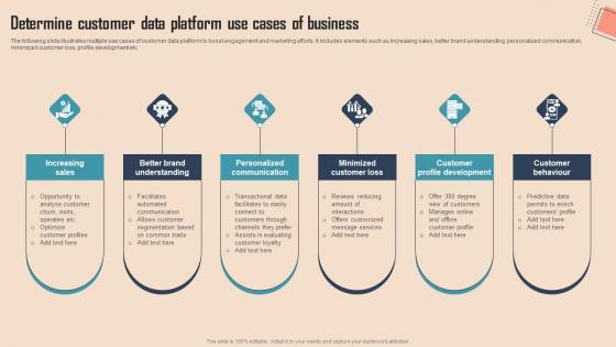 The following slide illustrates multiple use cases of customer data platform to boost engagement and marketing efforts. It includes elements such as increasing sales, better brand understanding, personalized communication, minimized customer loss, profile development etc. If you are looking for a format to display your unique thoughts, then the professionally designed Determine Customer Data Platform Use Comprehensive CDP Guide For Promoters Sample Pdf is the one for you. You can use it as a Google Slides template or a PowerPoint template. Incorporate impressive visuals, symbols, images, and other charts. Modify or reorganize the text boxes as you desire. Experiment with shade schemes and font pairings. Alter, share or cooperate with other people on your work. Download Determine Customer Data Platform Use Comprehensive CDP Guide For Promoters Sample Pdf and find out how to give a successful presentation. Present a perfect display to your team and make your presentation unforgettable. The following slide illustrates multiple use cases of customer data platform to boost engagement and marketing efforts. It includes elements such as increasing sales, better brand understanding, personalized communication, minimized customer loss, profile development etc.