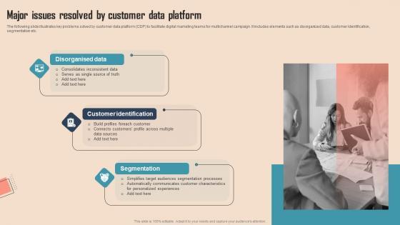 The following slide illustrates key problems solved by customer data platform CDP to facilitate digital marketing teams for multichannel campaign. It includes elements such as disorganized data, customer identification, segmentation etc. This Major Issues Resolved By Customer Data Platform Comprehensive CDP Guide For Promoters Sample Pdf is perfect for any presentation, be it in front of clients or colleagues. It is a versatile and stylish solution for organizing your meetings. The Major Issues Resolved By Customer Data Platform Comprehensive CDP Guide For Promoters Sample Pdf features a modern design for your presentation meetings. The adjustable and customizable slides provide unlimited possibilities for acing up your presentation. Slidegeeks has done all the homework before launching the product for you. So, do not wait, grab the presentation templates today The following slide illustrates key problems solved by customer data platform CDP to facilitate digital marketing teams for multichannel campaign. It includes elements such as disorganized data, customer identification, segmentation etc.