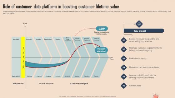 The following slide showcases how customer data platform assists in enhancing customer lifetime value. It includes elements such as relevancy, identity, capture, engage, convert, develop, mature, reactive, retain, brand loyalty, click through rate etc.Retrieve professionally designed Role Of Customer Data Platform In Boosting Comprehensive CDP Guide For Promoters Elements Pdf to effectively convey your message and captivate your listeners. Save time by selecting pre-made slideshows that are appropriate for various topics, from business to educational purposes. These themes come in many different styles, from creative to corporate, and all of them are easily adjustable and can be edited quickly. Access them as PowerPoint templates or as Google Slides themes. You do not have to go on a hunt for the perfect presentation because Slidegeeks got you covered from everywhere. The following slide showcases how customer data platform assists in enhancing customer lifetime value. It includes elements such as relevancy, identity, capture, engage, convert, develop, mature, reactive, retain, brand loyalty, click through rate etc.