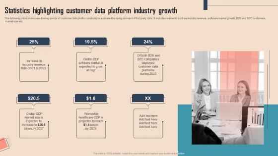 The following slide showcases the key trends of customer data platform industry to evaluate the rising demand of first party data. It includes elements such as industry revenue, software market growth, B2B and B2C customers, market size etc.Presenting this PowerPoint presentation, titled Statistics Highlighting Customer Data Platform Comprehensive CDP Guide For Promoters Topics Pdf, with topics curated by our researchers after extensive research. This editable presentation is available for immediate download and provides attractive features when used. Download now and captivate your audience. Presenting this Statistics Highlighting Customer Data Platform Comprehensive CDP Guide For Promoters Topics Pdf. Our researchers have carefully researched and created these slides with all aspects taken into consideration. This is a completely customizable Statistics Highlighting Customer Data Platform Comprehensive CDP Guide For Promoters Topics Pdf that is available for immediate downloading. Download now and make an impact on your audience. Highlight the attractive features available with our PPTs. The following slide showcases the key trends of customer data platform industry to evaluate the rising demand of first party data. It includes elements such as industry revenue, software market growth, B2B and B2C customers, market size etc.