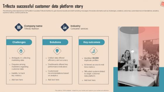 The following slide depicts how CDP platform assisted Trifecta Nutrition to gain desired results and draft marketing messages. It includes elements such as challenges, solutions, outcomes, customized recommendations, analytics, real time metrics, soiled systems etc.Do you know about Slidesgeeks Trifecta Successful Customer Data Platform Comprehensive CDP Guide For Promoters Background Pdf These are perfect for delivering any kind od presentation. Using it, create PowerPoint presentations that communicate your ideas and engage audiences. Save time and effort by using our pre-designed presentation templates that are perfect for a wide range of topic. Our vast selection of designs covers a range of styles, from creative to business, and are all highly customizable and easy to edit. Download as a PowerPoint template or use them as Google Slides themes. The following slide depicts how CDP platform assisted Trifecta Nutrition to gain desired results and draft marketing messages. It includes elements such as challenges, solutions, outcomes, customized recommendations, analytics, real time metrics, soiled systems etc.