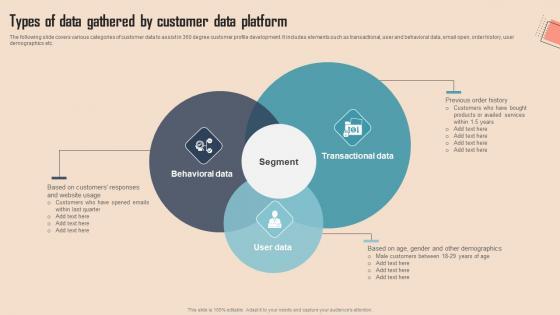 The following slide covers various categories of customer data to assist in 360 degree customer profile development. It includes elements such as transactional, user and behavioral data, email open, order history, user demographics etc. Find highly impressive Comprehensive Customer Data Platform Guide Optimizing Promotional Initiatives Types Data Gathered Customer Data Platform Professional PDF on Slidegeeks to deliver a meaningful presentation. You can save an ample amount of time using these presentation templates. No need to worry to prepare everything from scratch because Slidegeeks experts have already done a huge research and work for you. You need to download Comprehensive Customer Data Platform Guide Optimizing Promotional Initiatives Types Data Gathered Customer Data Platform Professional PDF for your upcoming presentation. All the presentation templates are 100 percent editable and you can change the color and personalize the content accordingly. Download now.