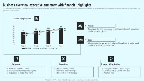 The slide presents overview of a company to gain brief of basic information of business background. It highlights information about financial highlights, mission statement, vision statement, background and history, key capabilities and promoters and stakeholders. Do you have to make sure that everyone on your team knows about any specific topic I yes, then you should give Business Overview Executive Summary With Financial Highlights Comprehensive Guide Background Pdf a try. Our experts have put a lot of knowledge and effort into creating this impeccable Business Overview Executive Summary With Financial Highlights Comprehensive Guide Background Pdf You can use this template for your upcoming presentations, as the slides are perfect to represent even the tiniest detail. You can download these templates from the Slidegeeks website and these are easy to edit. So grab these today. The slide presents overview of a company to gain brief of basic information of business background. It highlights information about financial highlights, mission statement, vision statement, background and history, key capabilities and promoters and stakeholders.