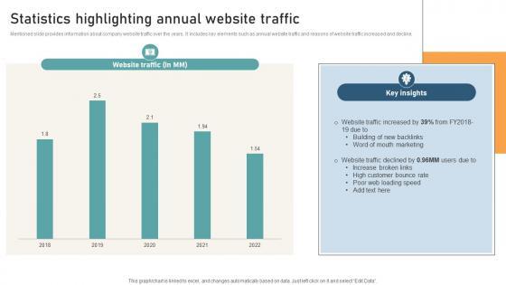 Mentioned slide provides information about company website traffic over the years. It includes key elements such as annual website traffic and reasons of website traffic increased and decline. Find highly impressive Comprehensive Guide For Website Statistics Highlighting Annual Website Traffic on Slidegeeks to deliver a meaningful presentation. You can save an ample amount of time using these presentation templates. No need to worry to prepare everything from scratch because Slidegeeks experts have already done a huge research and work for you. You need to download Comprehensive Guide For Website Statistics Highlighting Annual Website Traffic for your upcoming presentation. All the presentation templates are 100 percent editable and you can change the color and personalize the content accordingly. Download now Mentioned slide provides information about company website traffic over the years. It includes key elements such as annual website traffic and reasons of website traffic increased and decline.