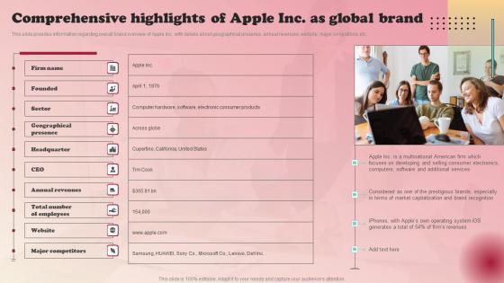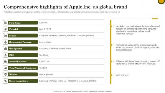 This slide provides information regarding overall brand overview of Apple Inc. with details about geographical presence, annual revenues, website, major competitors, etc. There are so many reasons you need a Comprehensive Highlights Of Apple Inc As Global Brand Background PDF. The first reason is you can not spend time making everything from scratch, Thus, Slidegeeks has made presentation templates for you too. You can easily download these templates from our website easily.