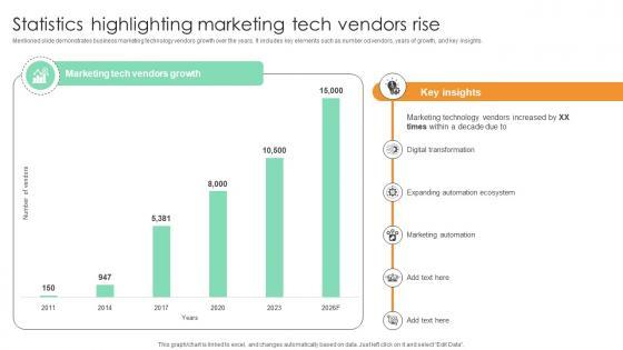 Mentioned slide demonstrates business marketing technology vendors growth over the years. It includes key elements such as number od vendors, years of growth, and key insights. Want to ace your presentation in front of a live audience Our Statistics Highlighting Marketing Tech Vendors Rise Comprehensive Guide For Marketing Technology can help you do that by engaging all the users towards you. Slidegeeks experts have put their efforts and expertise into creating these impeccable powerpoint presentations so that you can communicate your ideas clearly. Moreover, all the templates are customizable, and easy-to-edit and downloadable. Use these for both personal and commercial use. Mentioned slide demonstrates business marketing technology vendors growth over the years. It includes key elements such as number od vendors, years of growth, and key insights.