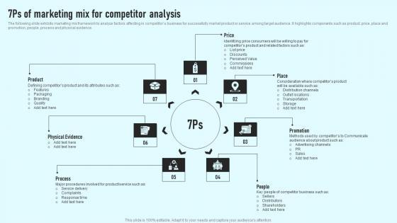 The following slide exhibits marketing mix framework to analyze factors affecting in competitors business for successfully market product or service among target audience. It highlights components such as product, price, place and promotion, people, process and physical evidence. Find a pre-designed and impeccable 7Ps Of Marketing Mix For Competitor Analysis Comprehensive Guide Themes Pdf The templates can ace your presentation without additional effort. You can download these easy-to-edit presentation templates to make your presentation stand out from others. So, what are you waiting for Download the template from Slidegeeks today and give a unique touch to your presentation. The following slide exhibits marketing mix framework to analyze factors affecting in competitors business for successfully market product or service among target audience. It highlights components such as product, price, place and promotion, people, process and physical evidence.