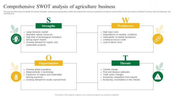 The purpose of this slide is to identify the industry strengths, weaknesses, opportunities, and threats related to the business. It guides the company to build on what it does well, address what theyre lacking, seize new openings, and minimize risks. There are so many reasons you need a Agriculture Business Plan Go To Market Strategy Comprehensive Swot Analysis Agriculture Mockup Pdf. The first reason is you can not spend time making everything from scratch, Thus, Slidegeeks has made presentation templates for you too. You can easily download these templates from our website easily. The purpose of this slide is to identify the industry strengths, weaknesses, opportunities, and threats related to the business. It guides the company to build on what it does well, address what theyre lacking, seize new openings, and minimize risks.