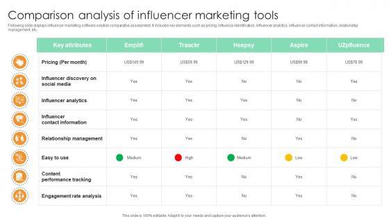 Following slide displays influencer marketing software solution comparative assessment. It includes key elements such as pricing, influence identification, influencer analytics, influencer contact information, relationship management, etc. This modern and well-arranged Comparison Analysis Of Influencer Marketing Tools Comprehensive Guide For Marketing Technology provides lots of creative possibilities. It is very simple to customize and edit with the Powerpoint Software. Just drag and drop your pictures into the shapes. All facets of this template can be edited with Powerpoint, no extra software is necessary. Add your own material, put your images in the places assigned for them, adjust the colors, and then you can show your slides to the world, with an animated slide included. Following slide displays influencer marketing software solution comparative assessment. It includes key elements such as pricing, influence identification, influencer analytics, influencer contact information, relationship management, etc.