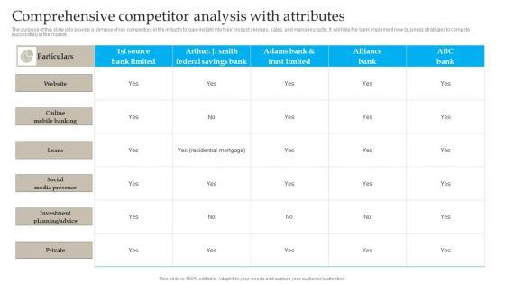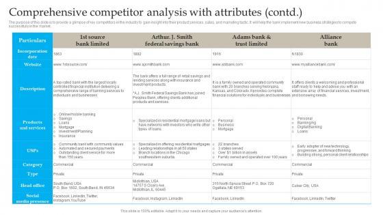 The purpose of this slide is to provide a glimpse of key competitors in the industry to gain insight into their product services, sales, and marketing tactic. It will help the bank implement new business strategies to compete successfully in the market. Get a simple yet stunning designed Comprehensive Competitor Analysis Banking Industry Business Plan Go To Market Strategy Portrait Pdf. It is the best one to establish the tone in your meetings. It is an excellent way to make your presentations highly effective. So, download this PPT today from Slidegeeks and see the positive impacts. Our easy to edit Comprehensive Competitor Analysis Banking Industry Business Plan Go To Market Strategy Portrait Pdf can be your go to option for all upcoming conferences and meetings. So, what are you waiting for Grab this template today. The purpose of this slide is to provide a glimpse of key competitors in the industry to gain insight into their product services, sales, and marketing tactic. It will help the bank implement new business strategies to compete successfully in the market.