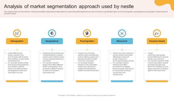 This slide provides an brief overview market segmentation approaches implemented by nestle along with significant use case. It includes segmentation types such as demographic, geographical, psychographic, behavioural and occasion based. There are so many reasons you need a Comprehensive Review Of Nestles Analysis Of Market Segmentation Approach Used By Nestle Strategy SS V. The first reason is you can not spend time making everything from scratch, Thus, Slidegeeks has made presentation templates for you too. You can easily download these templates from our website easily. This slide provides an brief overview market segmentation approaches implemented by nestle along with significant use case. It includes segmentation types such as demographic, geographical, psychographic, behavioural and occasion based.