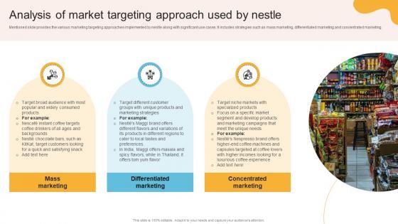 Mentioned slide provides the various marketing targeting approaches implemented by nestle along with significant use cases. It includes strategies such as mass marketing, differentiated marketing and concentrated marketing. Do you have to make sure that everyone on your team knows about any specific topic I yes, then you should give Comprehensive Review Of Nestles Analysis Of Market Targeting Approach Used By Nestle Strategy SS V a try. Our experts have put a lot of knowledge and effort into creating this impeccable Comprehensive Review Of Nestles Analysis Of Market Targeting Approach Used By Nestle Strategy SS V. You can use this template for your upcoming presentations, as the slides are perfect to represent even the tiniest detail. You can download these templates from the Slidegeeks website and these are easy to edit. So grab these today Mentioned slide provides the various marketing targeting approaches implemented by nestle along with significant use cases. It includes strategies such as mass marketing, differentiated marketing and concentrated marketing.