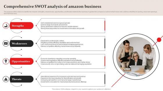 The purpose of this slide is to identify the industry strengths, weaknesses, opportunities, and threats related to the business. It guides the company to build on what it does well, address what theyre lacking, seize new openings, and minimize risks. Whether you have daily or monthly meetings, a brilliant presentation is necessary. Comprehensive Swot Analysis Amazon Business Plan Go To Market Strategy Demonstration Pdf can be your best option for delivering a presentation. Represent everything in detail using Comprehensive Swot Analysis Amazon Business Plan Go To Market Strategy Demonstration Pdf and make yourself stand out in meetings. The template is versatile and follows a structure that will cater to your requirements. All the templates prepared by Slidegeeks are easy to download and edit. Our research experts have taken care of the corporate themes as well. So, give it a try and see the results. The purpose of this slide is to identify the industry strengths, weaknesses, opportunities, and threats related to the business. It guides the company to build on what it does well, address what theyre lacking, seize new openings, and minimize risks.