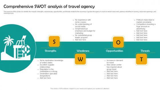 The purpose of this slide is to identify the industry strengths, weaknesses, opportunities, and threats related to the business. It guides the agency to build on what it does well, address what theyre lacking, seize new openings, and minimize risks. Crafting an eye catching presentation has never been more straightforward. Let your presentation shine with this tasteful yet straightforward Comprehensive Swot Analysis Group Tour Operator Business Plan Go To Market Strategy Background Pdf template. It offers a minimalistic and classy look that is great for making a statement. The colors have been employed intelligently to add a bit of playfulness while still remaining professional. Construct the ideal Comprehensive Swot Analysis Group Tour Operator Business Plan Go To Market Strategy Background Pdf that effortlessly grabs the attention of your audience Begin now and be certain to wow your customers The purpose of this slide is to identify the industry strengths, weaknesses, opportunities, and threats related to the business. It guides the agency to build on what it does well, address what theyre lacking, seize new openings, and minimize risks.