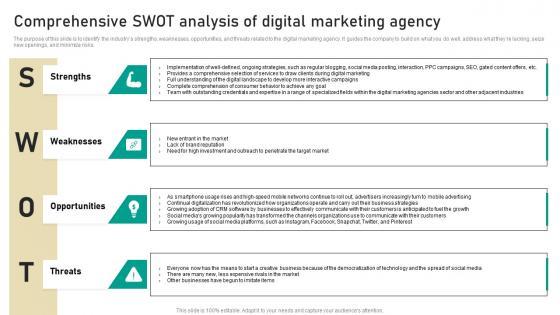 The purpose of this slide is to identify the industrys strengths, weaknesses, opportunities, and threats related to the digital marketing agency. It guides the company to build on what you do well, address what theyre lacking, seize new openings, and minimize risks. From laying roadmaps to briefing everything in detail, our templates are perfect for you. You can set the stage with your presentation slides. All you have to do is download these easy-to-edit and customizable templates. Comprehensive SWOT Analysis Of Agency Digital Marketing Business Portrait Pdf will help you deliver an outstanding performance that everyone would remember and praise you for. Do download this presentation today. The purpose of this slide is to identify the industrys strengths, weaknesses, opportunities, and threats related to the digital marketing agency. It guides the company to build on what you do well, address what theyre lacking, seize new openings, and minimize risks.