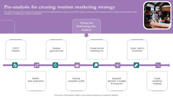 This slide showcases the pre analysis for developing tourism marketing strategy. It steps such as SWOT analysis, create guest and competitor persona, identify value proposition, create marketing mix, identify goals, metrices and activities. Whether you have daily or monthly meetings, a brilliant presentation is necessary. Pre Analysis For Creating Tourism Comprehensive Marketing Guide For Tourism Industry Themes Pdf can be your best option for delivering a presentation. Represent everything in detail using Pre Analysis For Creating Tourism Comprehensive Marketing Guide For Tourism Industry Themes Pdf and make yourself stand out in meetings. The template is versatile and follows a structure that will cater to your requirements. All the templates prepared by Slidegeeks are easy to download and edit. Our research experts have taken care of the corporate themes as well. So, give it a try and see the results. This slide showcases the pre analysis for developing tourism marketing strategy. It steps such as SWOT analysis, create guest and competitor persona, identify value proposition, create marketing mix, identify goals, metrices and activities.