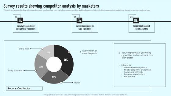 This slide showcases statistical data presenting survey results on how often marketers assess market competition. Its purpose is to control business positioning strategy and acquire maximum customer base. This modern and well-arranged Survey Results Showing Competitor Analysis By Marketers Comprehensive Guide Brochure Pdf provides lots of creative possibilities. It is very simple to customize and edit with the Powerpoint Software. Just drag and drop your pictures into the shapes. All facets of this template can be edited with Powerpoint no extra software is necessary. Add your own material, put your images in the places assigned for them, adjust the colors, and then you can show your slides to the world, with an animated slide included. This slide showcases statistical data presenting survey results on how often marketers assess market competition. Its purpose is to control business positioning strategy and acquire maximum customer base.