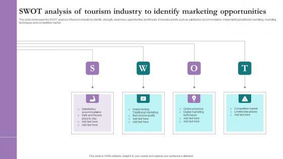 This slide showcases the SWOT analysis of tourism industry to identify strength, weakness, opportunities and threats. It includes points such as satisfactory accommodation, implementing traditional marketing, marketing techniques and competitive market. Crafting an eye catching presentation has never been more straightforward. Let your presentation shine with this tasteful yet straightforward Swot Analysis Of Tourism Comprehensive Marketing Guide For Tourism Industry Designs Pdf template. It offers a minimalistic and classy look that is great for making a statement. The colors have been employed intelligently to add a bit of playfulness while still remaining professional. Construct the ideal Swot Analysis Of Tourism Comprehensive Marketing Guide For Tourism Industry Designs Pdf that effortlessly grabs the attention of your audience Begin now and be certain to wow your customers This slide showcases the SWOT analysis of tourism industry to identify strength, weakness, opportunities and threats. It includes points such as satisfactory accommodation, implementing traditional marketing, marketing techniques and competitive market.