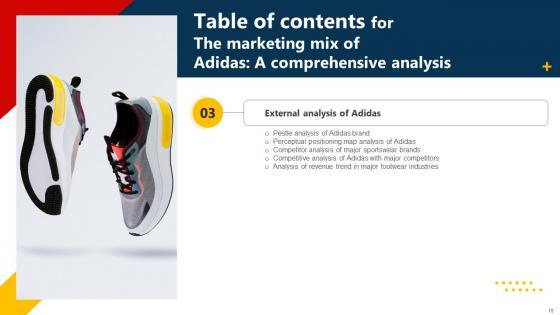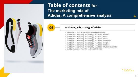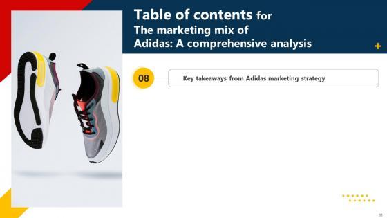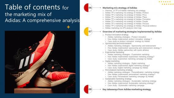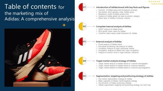 Coming up with a presentation necessitates that the majority of the effort goes into the content and the message you intend to convey. The visuals of a PowerPoint presentation can only be effective if it supplements and supports the story that is being told. Keeping this in mind our experts created Table Of Contents The Marketing Mix Of Adidas A Comprehensive Analysis Strategy SS V to reduce the time that goes into designing the presentation. This way, you can concentrate on the message while our designers take care of providing you with the right template for the situation. Our Table Of Contents The Marketing Mix Of Adidas A Comprehensive Analysis Strategy SS V are topically designed to provide an attractive backdrop to any subject. Use them to look like a presentation pro.