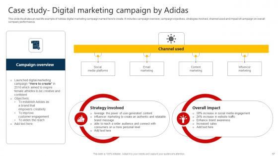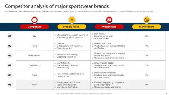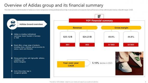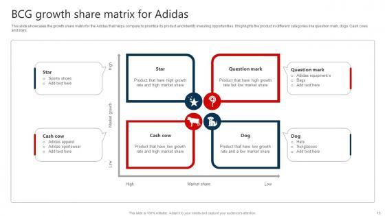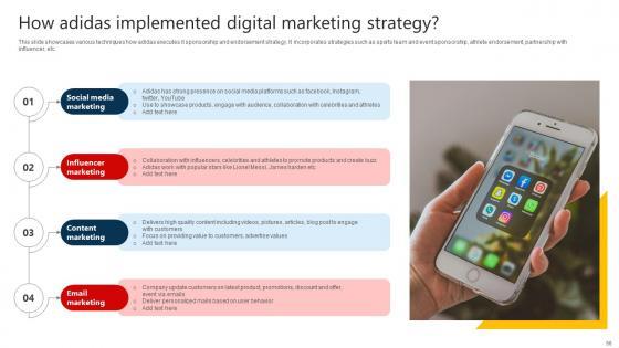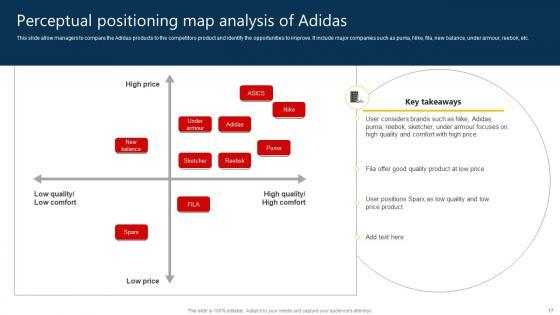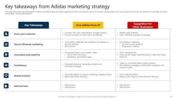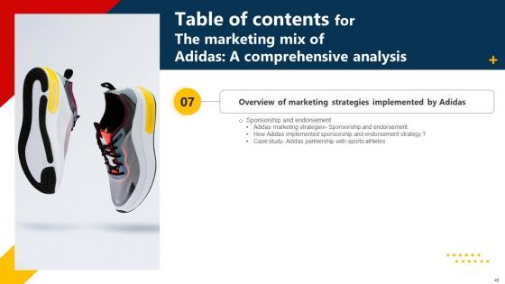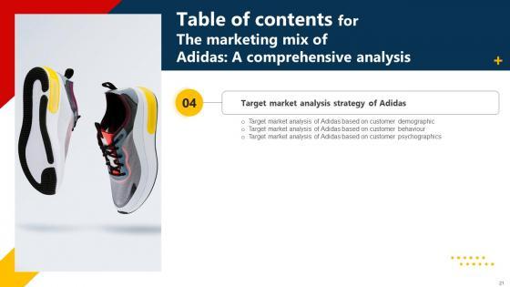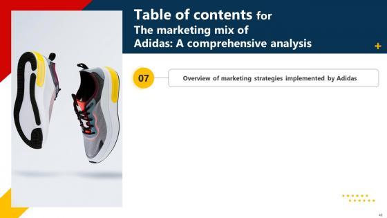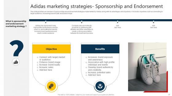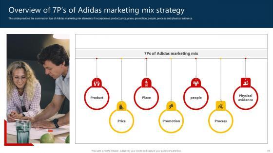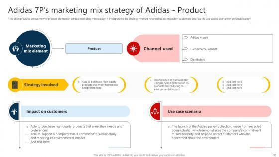 This The Marketing Mix Of Adidas A Comprehensive Analysis Strategy CD V is designed to help you retain your audiences attention. This content-ready PowerPoint Template enables you to take your audience on a journey and share information in a way that is easier to recall. It helps you highlight the crucial parts of your work so that the audience does not get saddled with information download. This seventy seven slide PPT Deck comes prepared with the graphs and charts you could need to showcase your information through visuals. You only need to enter your own data in them. Download this editable PowerPoint Theme and walk into that meeting with confidence. Our The Marketing Mix Of Adidas A Comprehensive Analysis Strategy CD V are topically designed to provide an attractive backdrop to any subject. Use them to look like a presentation pro.