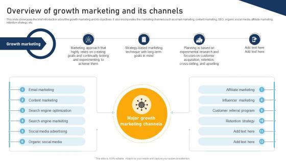 This slide showcases the brief introduction about the growth marketing and its objectives. It also incorporates the marketing channels such as email marketing, content marketing, SEO, organic social media, affiliate marketing, retention strategy, etc. Crafting an eye-catching presentation has never been more straightforward. Let your presentation shine with this tasteful yet straightforward A Comprehensive Approach To Overview Of Growth Marketing And Its Channels MKT SS V template. It offers a minimalistic and classy look that is great for making a statement. The colors have been employed intelligently to add a bit of playfulness while still remaining professional. Construct the ideal A Comprehensive Approach To Overview Of Growth Marketing And Its Channels MKT SS V that effortlessly grabs the attention of your audience Begin now and be certain to wow your customers This slide showcases the brief introduction about the growth marketing and its objectives. It also incorporates the marketing channels such as email marketing, content marketing, SEO, organic social media, affiliate marketing, retention strategy, etc.
