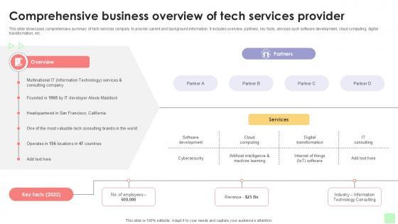 This slide showcases comprehensive summary of tech services company to provide current and background information. It includes overview, partners, key facts, services such software development, cloud computing, digital transformation, etc. Step up your game with our enchanting Comprehensive Business Overview Detailed Business Account PPT Example Strategy SS V deck, guaranteed to leave a lasting impression on your audience. Crafted with a perfect balance of simplicity, and innovation, our deck empowers you to alter it to your specific needs. You can also change the color theme of the slide to mold it to your companys specific needs. Save time with our ready-made design, compatible with Microsoft versions and Google Slides. Additionally, its available for download in various formats including JPG, JPEG, and PNG. Outshine your competitors with our fully editable and customized deck. This slide showcases comprehensive summary of tech services company to provide current and background information. It includes overview, partners, key facts, services such software development, cloud computing, digital transformation, etc.
