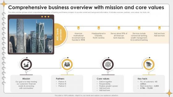 This slide provides glimpse about comprehensive summary of banking and finance company to provide current and background information. It includes overview, partners, core values, key facts, etc. Do you have an important presentation coming up Are you looking for something that will make your presentation stand out from the rest Look no further than Comprehensive Business Overview Planning Outreach Campaigns PPT PowerPoint. With our professional designs, you can trust that your presentation will pop and make delivering it a smooth process. And with Slidegeeks, you can trust that your presentation will be unique and memorable. So why wait Grab Comprehensive Business Overview Planning Outreach Campaigns PPT PowerPoint today and make your presentation stand out from the rest This slide provides glimpse about comprehensive summary of banking and finance company to provide current and background information. It includes overview, partners, core values, key facts, etc.