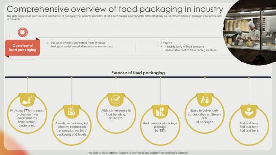 The slide showcases overview and introduction of packaging that ensures protection of food from harmful environmental factors that may cause contamination or damage to the food quality in container. There are so many reasons you need a Comprehensive Overview Of Effective Strategies For Strengthening Food Ppt Presentation. The first reason is you can not spend time making everything from scratch, Thus, Slidegeeks has made presentation templates for you too. You can easily download these templates from our website easily. The slide showcases overview and introduction of packaging that ensures protection of food from harmful environmental factors that may cause contamination or damage to the food quality in container.