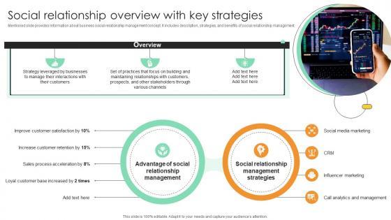 Mentioned slide provides information about business social relationship management concept. It includes description, strategies, and benefits of social relationship management. Slidegeeks is one of the best resources for PowerPoint templates. You can download easily and regulate Social Relationship Overview With Key Strategies Comprehensive Guide For Marketing Technology for your personal presentations from our wonderful collection. A few clicks is all it takes to discover and get the most relevant and appropriate templates. Use our Templates to add a unique zing and appeal to your presentation and meetings. All the slides are easy to edit and you can use them even for advertisement purposes. Mentioned slide provides information about business social relationship management concept. It includes description, strategies, and benefits of social relationship management.