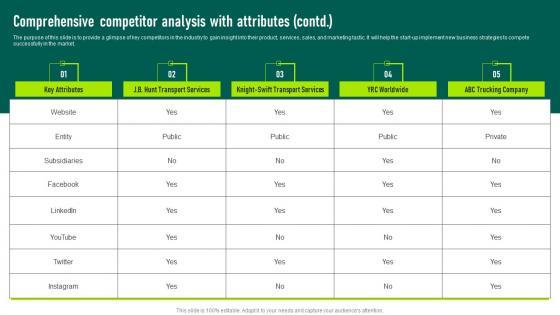 The purpose of this slide is to provide a glimpse of key competitors in the industry to gain insight into their products, services, sales, and marketing tactic. It will help the firm implement new business strategies to compete successfully in the market.Want to ace your presentation in front of a live audience Our Comprehensive Competitor Analysis With Attributes Freight Trucking Business Plan Professional Pdf can help you do that by engaging all the users towards you.. Slidegeeks experts have put their efforts and expertise into creating these impeccable powerpoint presentations so that you can communicate your ideas clearly. Moreover, all the templates are customizable, and easy-to-edit and downloadable. Use these for both personal and commercial use. The purpose of this slide is to provide a glimpse of key competitors in the industry to gain insight into their products, services, sales, and marketing tactic. It will help the firm implement new business strategies to compete successfully in the market.