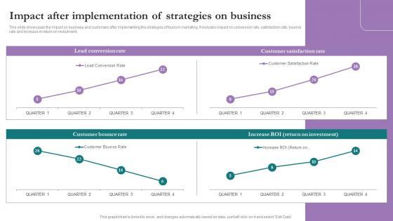 This slide showcases the impact on business and customers after implementing the strategies of tourism marketing. It includes impact on conversion rate, satisfaction rate, bounce rate and increase in return on investment. Presenting this PowerPoint presentation, titled Impact After Implementation Comprehensive Marketing Guide For Tourism Industry Professional Pdf, with topics curated by our researchers after extensive research. This editable presentation is available for immediate download and provides attractive features when used. Download now and captivate your audience. Presenting this Impact After Implementation Comprehensive Marketing Guide For Tourism Industry Professional Pdf. Our researchers have carefully researched and created these slides with all aspects taken into consideration. This is a completely customizable Impact After Implementation Comprehensive Marketing Guide For Tourism Industry Professional Pdf that is available for immediate downloading. Download now and make an impact on your audience. Highlight the attractive features available with our PPTs. This slide showcases the impact on business and customers after implementing the strategies of tourism marketing. It includes impact on conversion rate, satisfaction rate, bounce rate and increase in return on investment.