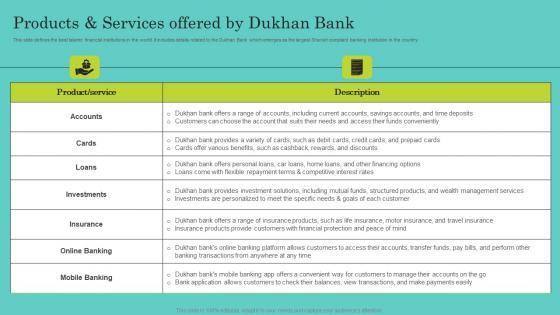This slide defines the best Islamic financial institutions in the world. It includes details related to the Dukhan Bank which emerges as the largest Shariah compliant banking institution in the country. Get a simple yet stunning designed Products And Services Offered By Dukhan Bank Comprehensive Guide To Islamic Professional Pdf. It is the best one to establish the tone in your meetings. It is an excellent way to make your presentations highly effective. So, download this PPT today from Slidegeeks and see the positive impacts. Our easy-to-edit Products And Services Offered By Dukhan Bank Comprehensive Guide To Islamic Professional Pdf can be your go-to option for all upcoming conferences and meetings. So, what are you waiting for Grab this template today. This slide defines the best Islamic financial institutions in the world. It includes details related to the Dukhan Bank which emerges as the largest Shariah compliant banking institution in the country.