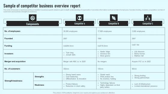 This slide showcases a report presenting competitors business specific details to gain in depth understanding of organization. It provides information such as number of employees, founded, funding, investors, acquisition, number of customers and business strengths and weakness. Do you have an important presentation coming up Are you looking for something that will make your presentation stand out from the rest Look no further than Sample Of Competitor Business Overview Report Comprehensive Guide Guidelines Pdf With our professional designs, you can trust that your presentation will pop and make delivering it a smooth process. And with Slidegeeks, you can trust that your presentation will be unique and memorable. So why wait Grab Sample Of Competitor Business Overview Report Comprehensive Guide Guidelines Pdf today and make your presentation stand out from the rest. This slide showcases a report presenting competitors business specific details to gain in depth understanding of organization. It provides information such as number of employees, founded, funding, investors, acquisition, number of customers and business strengths and weakness.