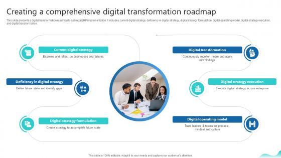 This slide presents a digital transformation roadmap to optimize ERP implementation. It includes current digital strategy, deficiency in digital strategy, digital strategy formulation, digital operating model, digital strategy execution, and digital transformation. Find highly impressive Creating A Comprehensive Digital Transformation Roadmap Erp And Digital Transformation For Maximizing DT SS V on Slidegeeks to deliver a meaningful presentation. You can save an ample amount of time using these presentation templates. No need to worry to prepare everything from scratch because Slidegeeks experts have already done a huge research and work for you. You need to download Creating A Comprehensive Digital Transformation Roadmap Erp And Digital Transformation For Maximizing DT SS V for your upcoming presentation. All the presentation templates are 100 percent editable and you can change the color and personalize the content accordingly. Download now This slide presents a digital transformation roadmap to optimize ERP implementation. It includes current digital strategy, deficiency in digital strategy, digital strategy formulation, digital operating model, digital strategy execution, and digital transformation.