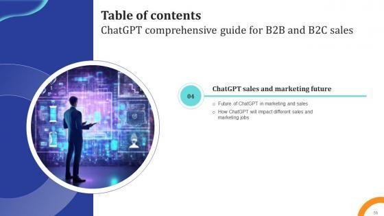 Find highly impressive Table Of Contents ChatGpt Comprehensive Guide For B2b And B2c Sales Ppt Sample ChatGpt SS V on Slidegeeks to deliver a meaningful presentation. You can save an ample amount of time using these presentation templates. No need to worry to prepare everything from scratch because Slidegeeks experts have already done a huge research and work for you. You need to download Table Of Contents ChatGpt Comprehensive Guide For B2b And B2c Sales Ppt Sample ChatGpt SS V for your upcoming presentation. All the presentation templates are 100 percent editable and you can change the color and personalize the content accordingly. Download now Our Table Of Contents ChatGpt Comprehensive Guide For B2b And B2c Sales Ppt Sample ChatGpt SS V are topically designed to provide an attractive backdrop to any subject. Use them to look like a presentation pro.