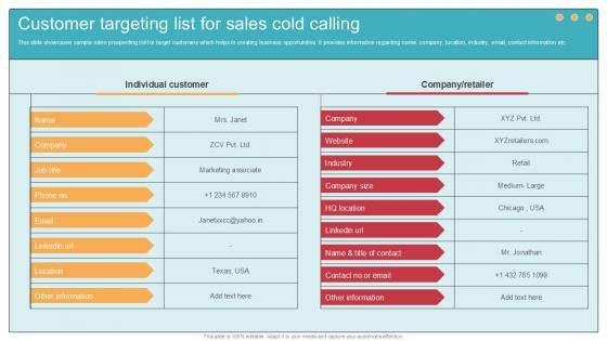 This slide showcases sample sales prospecting list for target customers which helps in creating business opportunities. It provides information regarding name. company, location, industry, email, contact information etc. Crafting an eye-catching presentation has never been more straightforward. Let your presentation shine with this tasteful yet straightforward Customer Targeting List For Sales Cold Comprehensive Guide To Wholesale Ppt Slide template. It offers a minimalistic and classy look that is great for making a statement. The colors have been employed intelligently to add a bit of playfulness while still remaining professional. Construct the ideal Customer Targeting List For Sales Cold Comprehensive Guide To Wholesale Ppt Slide that effortlessly grabs the attention of your audience Begin now and be certain to wow your customers This slide showcases sample sales prospecting list for target customers which helps in creating business opportunities. It provides information regarding name. company, location, industry, email, contact information etc.