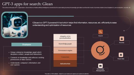 This slide showcases GPT 3 application Glean which is helpful artificial intelligence oriented tool for automating business knowledge generation and transfer needs. It provides details about adaptive AI, personalization, security, etc. Crafting an eye catching presentation has never been more straightforward. Let your presentation shine with this tasteful yet straightforward Comprehensive Resource Guide To Master GPT 3 GPT 3 Apps For Search Glean Inspiration PDF template. It offers a minimalistic and classy look that is great for making a statement. The colors have been employed intelligently to add a bit of playfulness while still remaining professional. Construct the ideal Comprehensive Resource Guide To Master GPT 3 GPT 3 Apps For Search Glean Inspiration PDF that effortlessly grabs the attention of your audience. Begin now and be certain to wow your customers.
