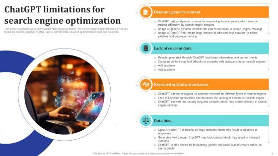 This slide showcases various limitations of leveraging ChatGPT for search engine optimization. Key issues faced are dynamic generic content, lack of current data, keyword optimization issues and data bias. Slidegeeks is here to make your presentations a breeze with ChatGpt Comprehensive Guide ChatGpt Limitations For Search Engine Ppt Template ChatGpt SS V With our easy-to-use and customizable templates, you can focus on delivering your ideas rather than worrying about formatting. With a variety of designs to choose from, you are sure to find one that suits your needs. And with animations and unique photos, illustrations, and fonts, you can make your presentation pop. So whether you are giving a sales pitch or presenting to the board, make sure to check out Slidegeeks first This slide showcases various limitations of leveraging ChatGPT for search engine optimization. Key issues faced are dynamic generic content, lack of current data, keyword optimization issues and data bias.