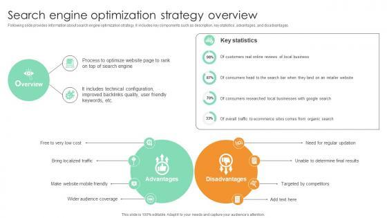Following slide provides information about search engine optimization strategy. It includes key components such as description, key statistics, advantages, and disadvantages.The best PPT templates are a great way to save time, energy, and resources. Slidegeeks have 100 percent editable powerpoint slides making them incredibly versatile. With these quality presentation templates, you can create a captivating and memorable presentation by combining visually appealing slides and effectively communicating your message. Download Search Engine Optimization Strategy Overview Comprehensive Guide For Marketing Technology from Slidegeeks and deliver a wonderful presentation. Following slide provides information about search engine optimization strategy. It includes key components such as description, key statistics, advantages, and disadvantages.