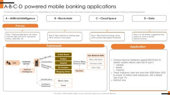 This slide shows details of ABCD tech integration i.e., artificial intelligence, block chain, cloud space and data. It also includes information regarding process, framework and application of ABCD powered banking applicationsFind a pre-designed and impeccable A B C D Powered Mobile Banking Comprehensive Smartphone Banking Formats Pdf. The templates can ace your presentation without additional effort. You can download these easy-to-edit presentation templates to make your presentation stand out from others. So, what are you waiting for Download the template from Slidegeeks today and give a unique touch to your presentation. This slide shows details of ABCD tech integration i.e., artificial intelligence, block chain, cloud space and data. It also includes information regarding process, framework and application of ABCD powered banking applications