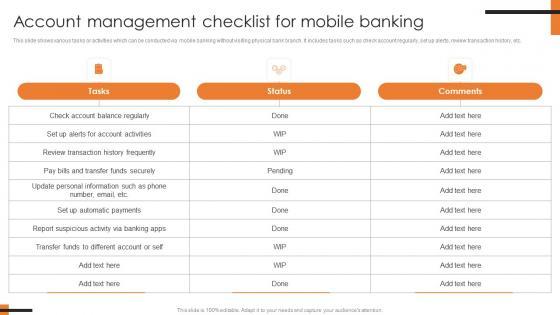 This slide shows various tasks or activities which can be conducted via mobile banking without visiting physical bank branch. It includes tasks such as check account regularly, set up alerts, review transaction history, etc.Boost your pitch with our creative Account Management Checklist For Mobile Comprehensive Smartphone Banking Sample Pdf. Deliver an awe-inspiring pitch that will mesmerize everyone. Using these presentation templates you will surely catch everyones attention. You can browse the ppts collection on our website. We have researchers who are experts at creating the right content for the templates. So you do not have to invest time in any additional work. Just grab the template now and use them. This slide shows various tasks or activities which can be conducted via mobile banking without visiting physical bank branch. It includes tasks such as check account regularly, set up alerts, review transaction history, etc.